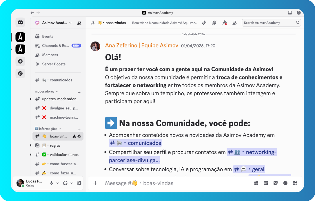 O lugar ideal para você fazer networking, conhecer outros alunos da Asimov e até receber oportunidades de trabalho.